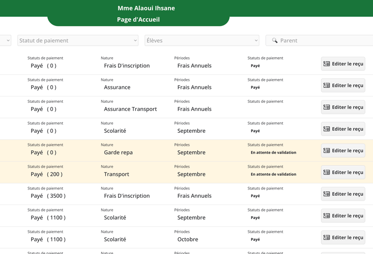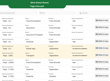Suivi des paiements de frais scolaires, cantine, et activités.